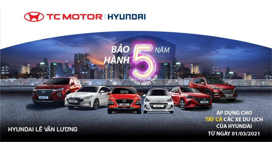 Hà Nội, ngày 01/03/2021, TC MOTOR chính thức thông báo tăng thời gian bảo hành cho tất cả các mẫu xe du lịch Hyundai từ 3 năm thành 5 năm. Thời gian áp dụng từ 01/03/2021.